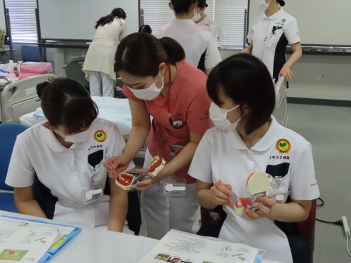 本研修では、基本的な手技を歯科衛生士さんからご指導いただき、看護師からは看護ケアの視点で指導が行われました。