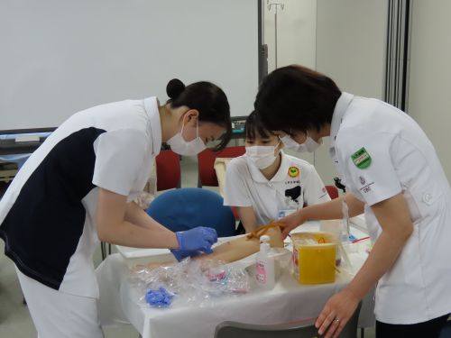 腕モデルを使用し実際に針を使って行う研修でしたが、少人数制での研修であり指導者から丁寧な指導を受けることができていました。