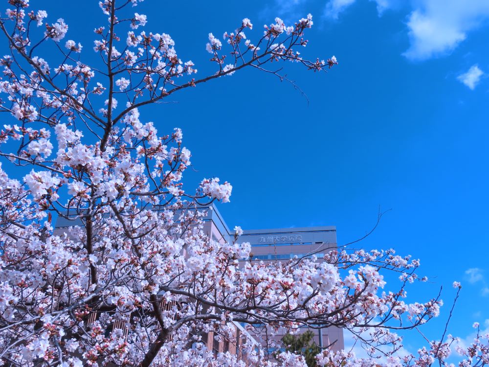令和7年4月1日、九州大学病院構内の桜が満開を迎える中、九州大学病院看護部に